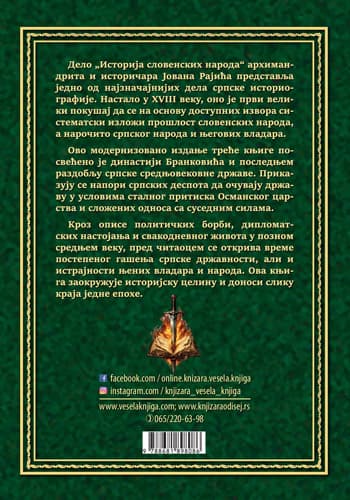Istorijsko delo Jovana Rajića ubraja se među najvrednije zapise o razvoju i trajanju srpske države kroz vekove. U ovom izdanju čitaocu se pruža jasan i pristupačan pregled ključnih ličnosti, dinastija i događaja koji su oblikovali nacionalnu istoriju. Zahvaljujući podeli na tri knjige, sadržaj je organizovan pregledno, što omogućava lakše praćenje složenih istorijskih tokova.
